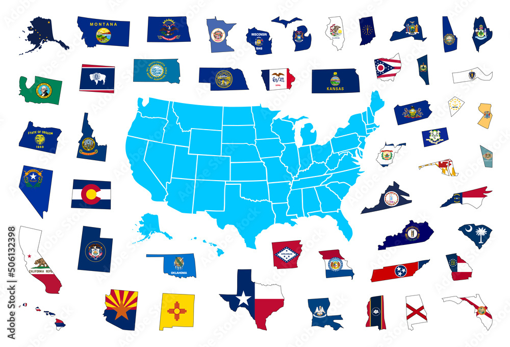 Blue map of United States of America with borders and short names