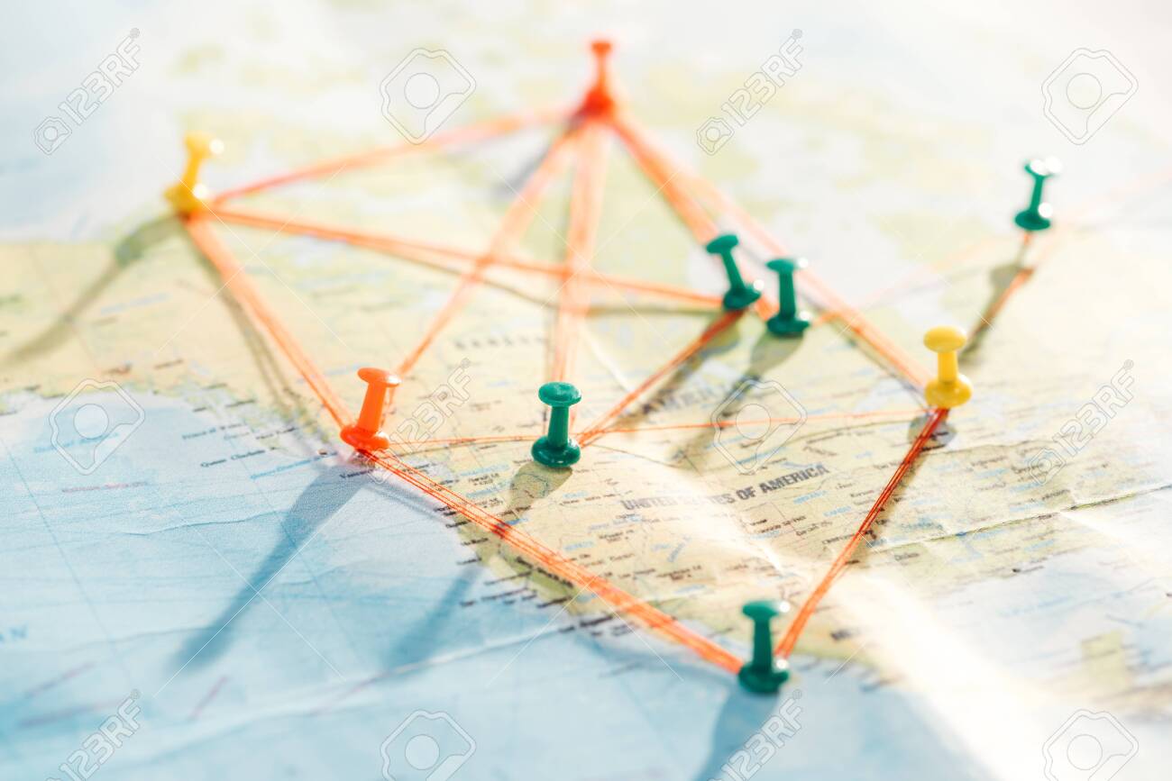Push pins and string on a map of north america โ Photo โ Lightstock
