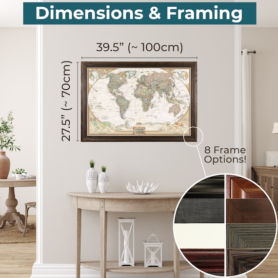 Framed Vintage Style World Map | Vintage Looking World Map Push